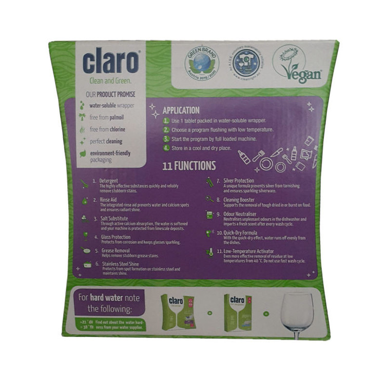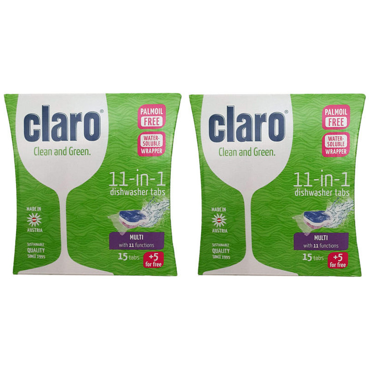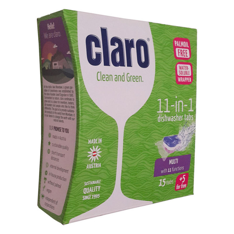 در اینکه ماشین ظرفشویی، ظرفها را تمیزتر میکند شکی نیست اما گاهی اوقات پیش میآید که ظروف مخصوصا نوع شیشهای، کدر و سفید باقی میمانند که که این به دلیل استفاده بیش از حد از پودر و یا قرص نامرغوب است. قرص ماشین ظرفشویی کلارو، به دلیل فرمولاسیون استاندارد به راحتی لکهای روی ظرف را پاک میکند و به دلیل شکل قرصی، مشکلات پودر را که ممکن است مقدارش کم و زیاد شود را ندارد. این قرص به دلیل داشتن مواد پاک کننده، نمک و جلادهنده نیازی به استفادهی جداگانه از نمک و مایع ضد لک ندارد و با یک قرص و به راحتی ظروف پاک، ضدعفونی و درخشان خواهند شد. در ترکیبات این قرص که در بستهبندی جدید 20 عددی عرضه شده، از موادی استفاده شده که علاوه بر اینکه درمقابل آهکِ آب و تاثیرشان بر ظروف مقاوم هستند در ماشین ظرفشویی تهنشین نمیشوند. یکی دیگر از قابلیتهای 11 گانهی قرص کلارو محافظت ازظروف شیشهای و نقره است و نیازی به آب داغ برای شستوشوی بهتر ندارد و با درجه دمای استاندارد ماشینهای ظرفشویی عملکردی فوقالعاده خواهد اشت. کلارو برندی اتریشی است که در زمینهی تولید محصولات مرتبط با ماشین ظرفشویی، سابقهای درخشان دارد و به دلیل ترکیبات استاندارد عمر ماشین را نیز افزایش میدهد.