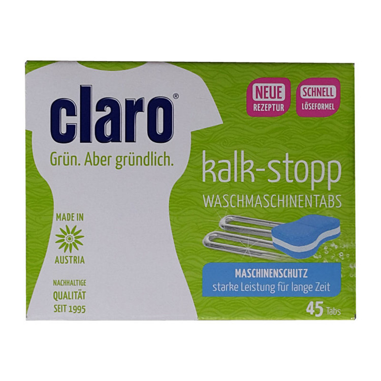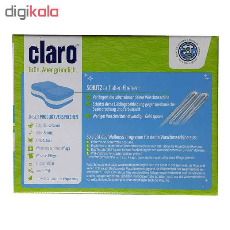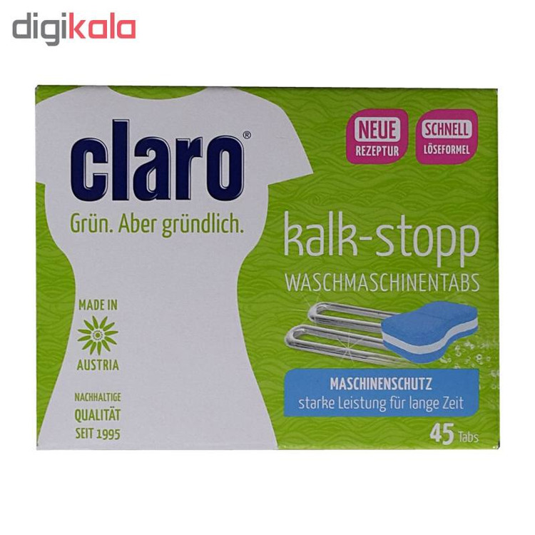 قرص جرمگیر برند «کلارو» (Claro) مدل «Kalk» دارای 45 عدد قرص در یک بسته است. سختی آب و املاحش در هر شهری با دیگری متفاوت است. همین املاح ممکن است باعث تجمع رسوب در ماشین لباسشویی شوند و برای عملکرد آن مشکل ایجاد کنند. برای مراقبت از ماشین لباسشویی باید هر از گاهی بسته به سختی آب، آن را جرمگیری کرد. برای جرمگیری اصولی و استاندارد، میتوان از قرص جرمگیر کلارو (Claro) استفاده کرد. نحوهی استفاده از این قرص به این صورت است که باید همراه با لباسها در مخزن ماشین قرار داده شود یا همراه با شویندهی ماشین لباسشویی در جای مخصوص شوینده انداخته شود. این قرص بهمحض تماس با آب، حتی آبی با دمای 30 درجه، شروع به حلشدن میکند و با نفوذ به همهی قسمتهای داخلی ماشین، آن را از آهک، رسوب و جرم پاک میکند. با توجه به فرمولاسیون خاص، استفادهی همزمانش با پودر شوینده، باعث کاهش مصرف پودر و نیز محافظت از پارچه و رنگ لباسهای شما شده و به فرایند شستوشو کمک و آن را آسان هم میکند. و نتیجه بهتری از شستشوی لباس را به شما میدهدو همچنین باعث عمر طولانی تر ماشین لباسشویی میشود .کلارو برندی اتریشی است که در زمینهی تولید محصولات بهداشتی مرتبط با دستگاههای برقی، آوازه و سابقهای درخشان دارد.